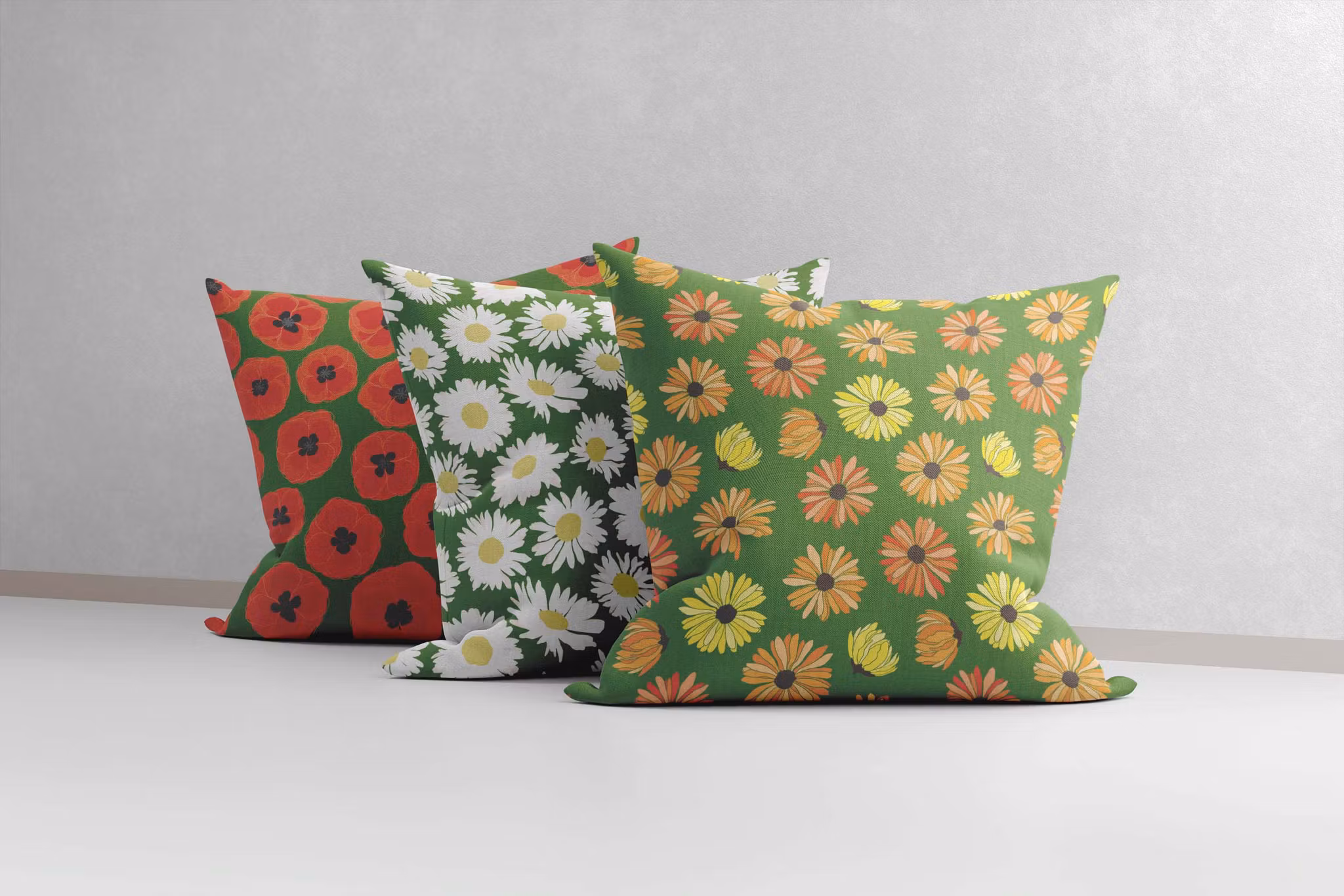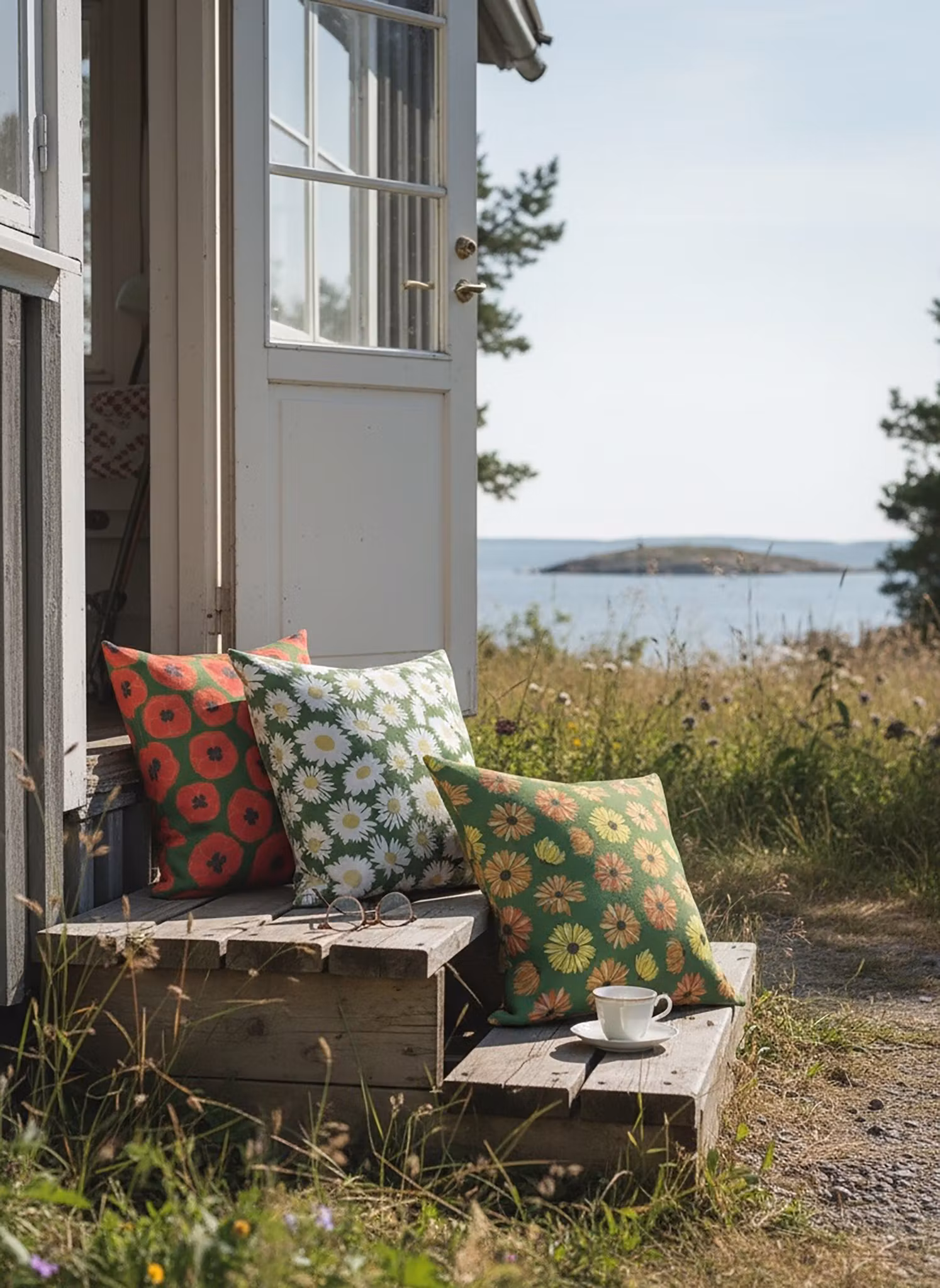 Dessa tre blomsterkarameller, för sommarkänsla och liv på trappen till sommarhuset, i torpets kökssoffa eller i trädgårdssoffan. Alla tre delar samma skönt gröna bakgrundsfärg.